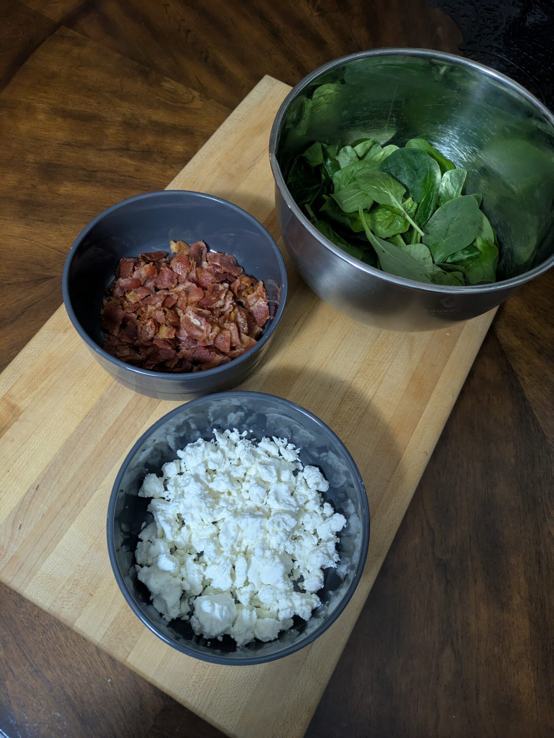 1. Meanwhile you can prep your other ingredients. Start by placing the baby spinach in a medium bowl and set aside. Chop bacon and set aside .Crumble goat cheese and set aside.