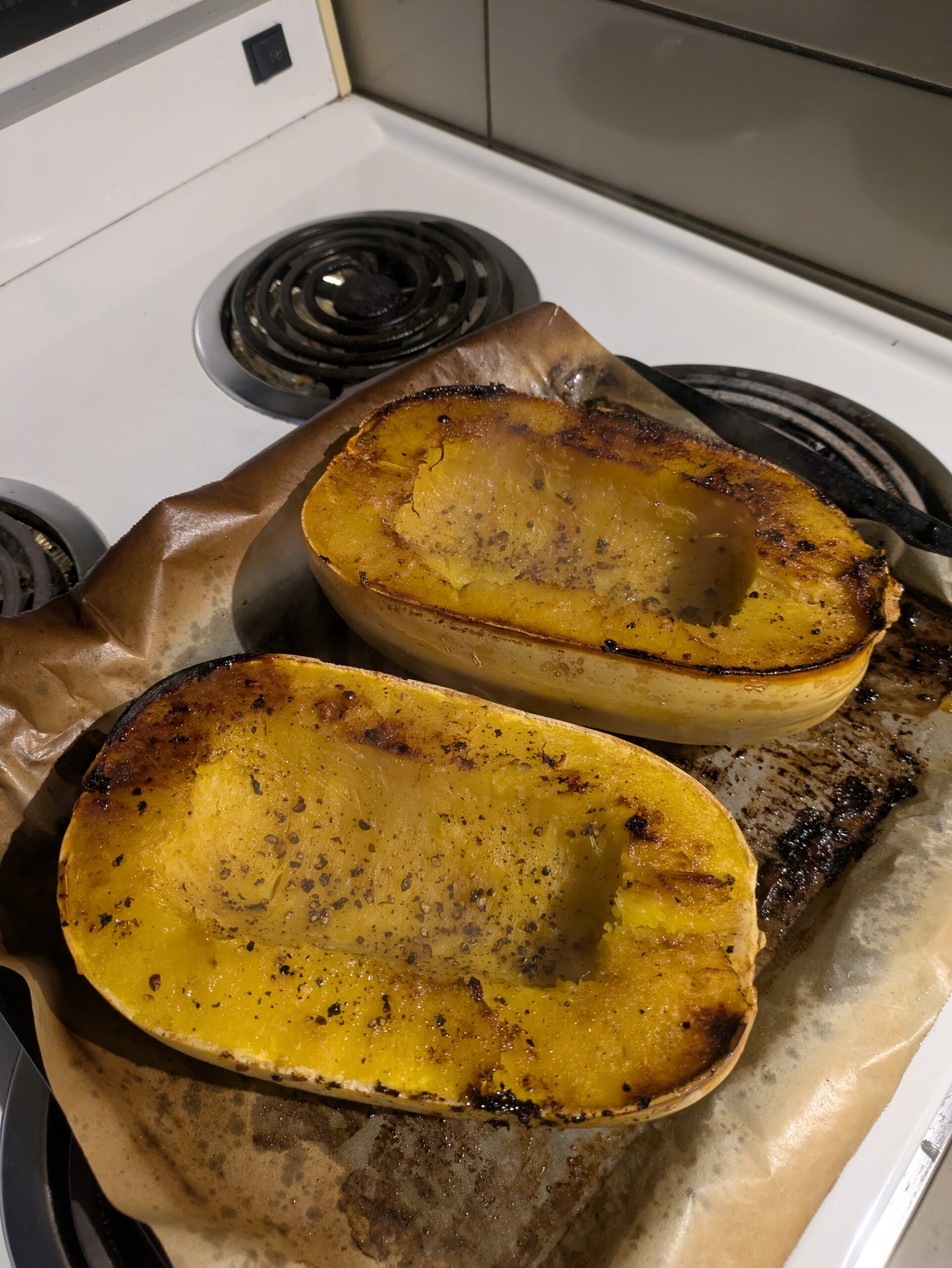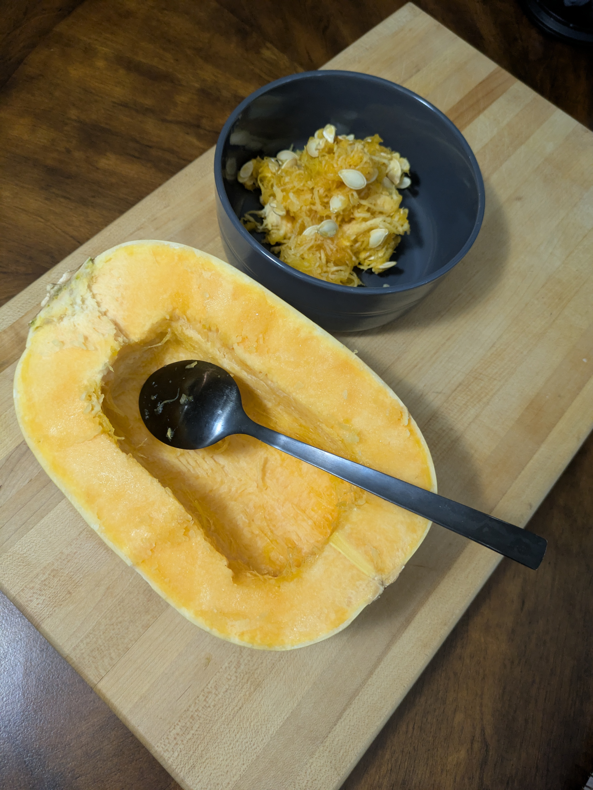 1. While the bacon is cooking you can prepare the squash by cutting it in half with a sharp knife and removing the seeds with a metal spoon.