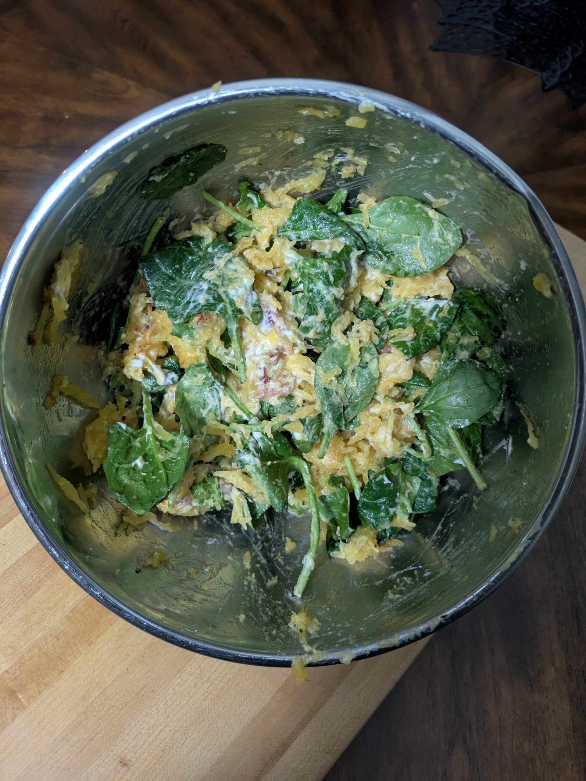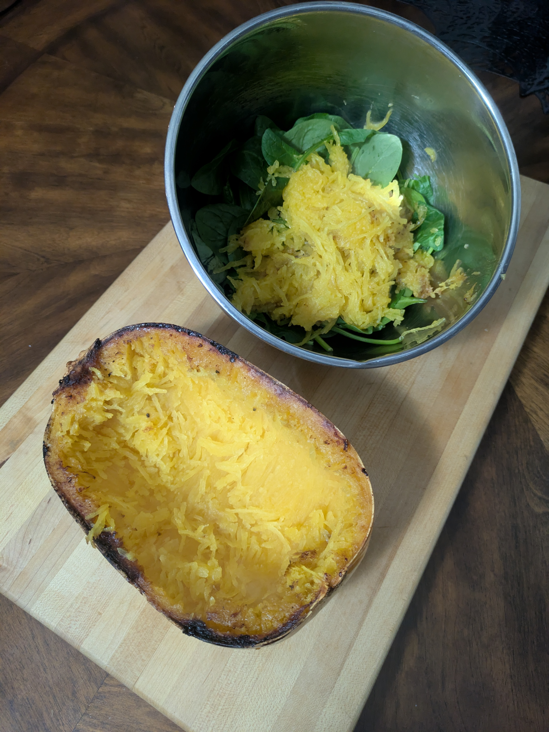 Use a fork to separate the strands of spaghetti squash, scoop about half the squash into the bowl with the spinach.