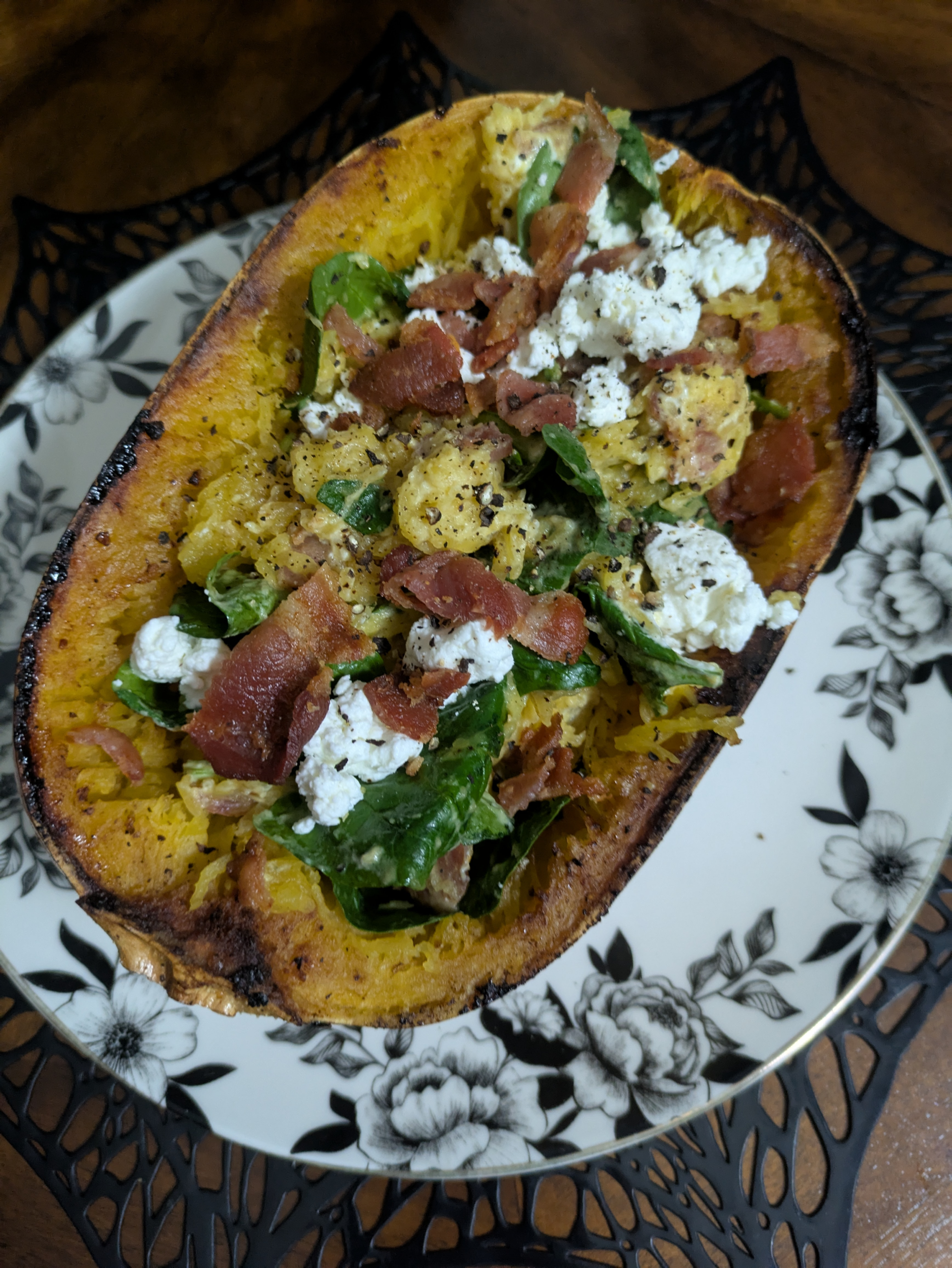 Bacon and goat cheese stuffed spaghetti squash