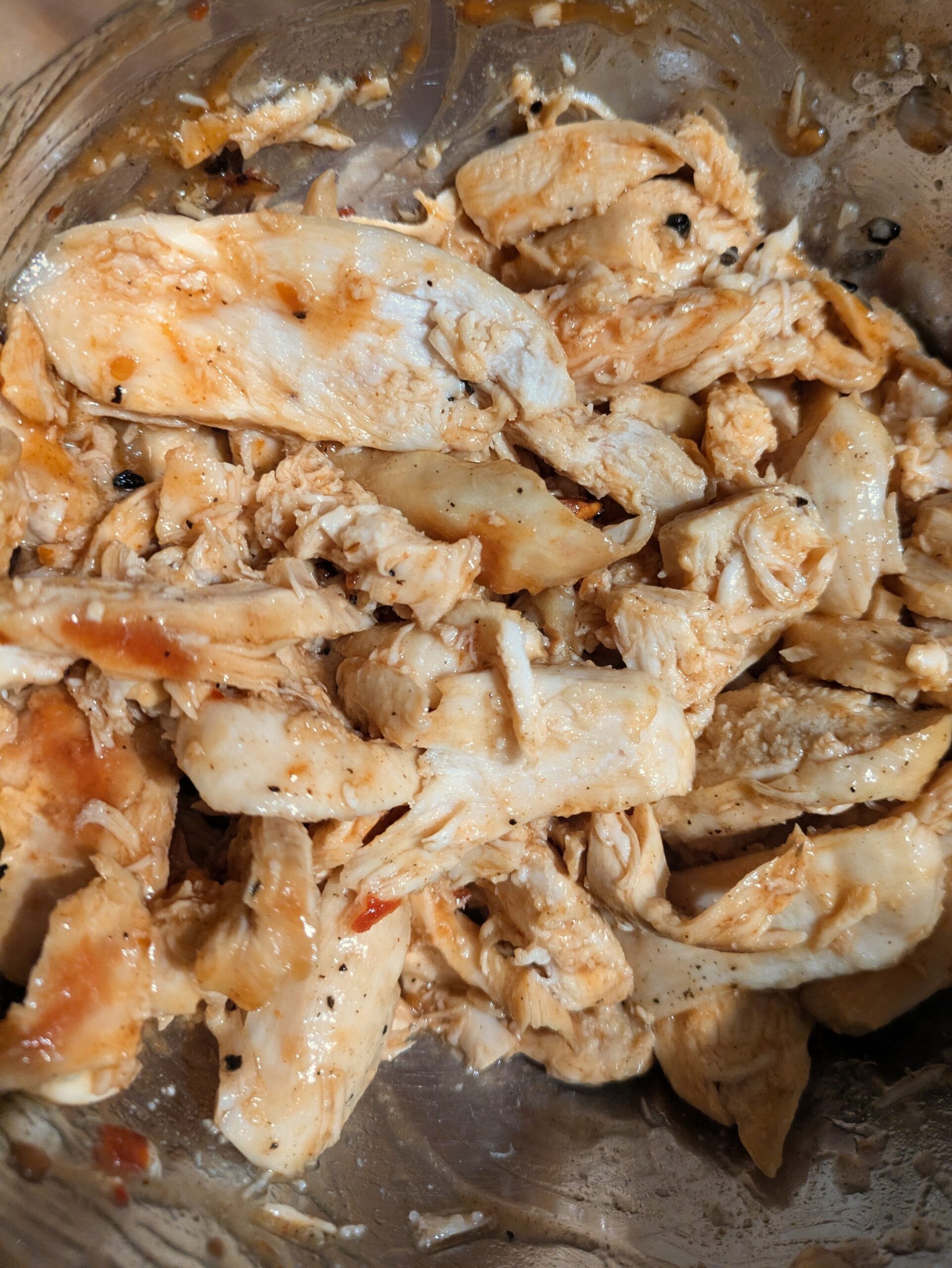 As the onions caramelize you can prepare the chicken and chop the apples. if you're cooking your own chicken breasts or thighs, season it simply with a little oil and salt and pepper and pop it in the oven for 20 minutes or so. If you're using rotisserie chicken now is a good time to pull it. When the chicken is ready, toss in a medium bowl with the BBQ sauce until coated.