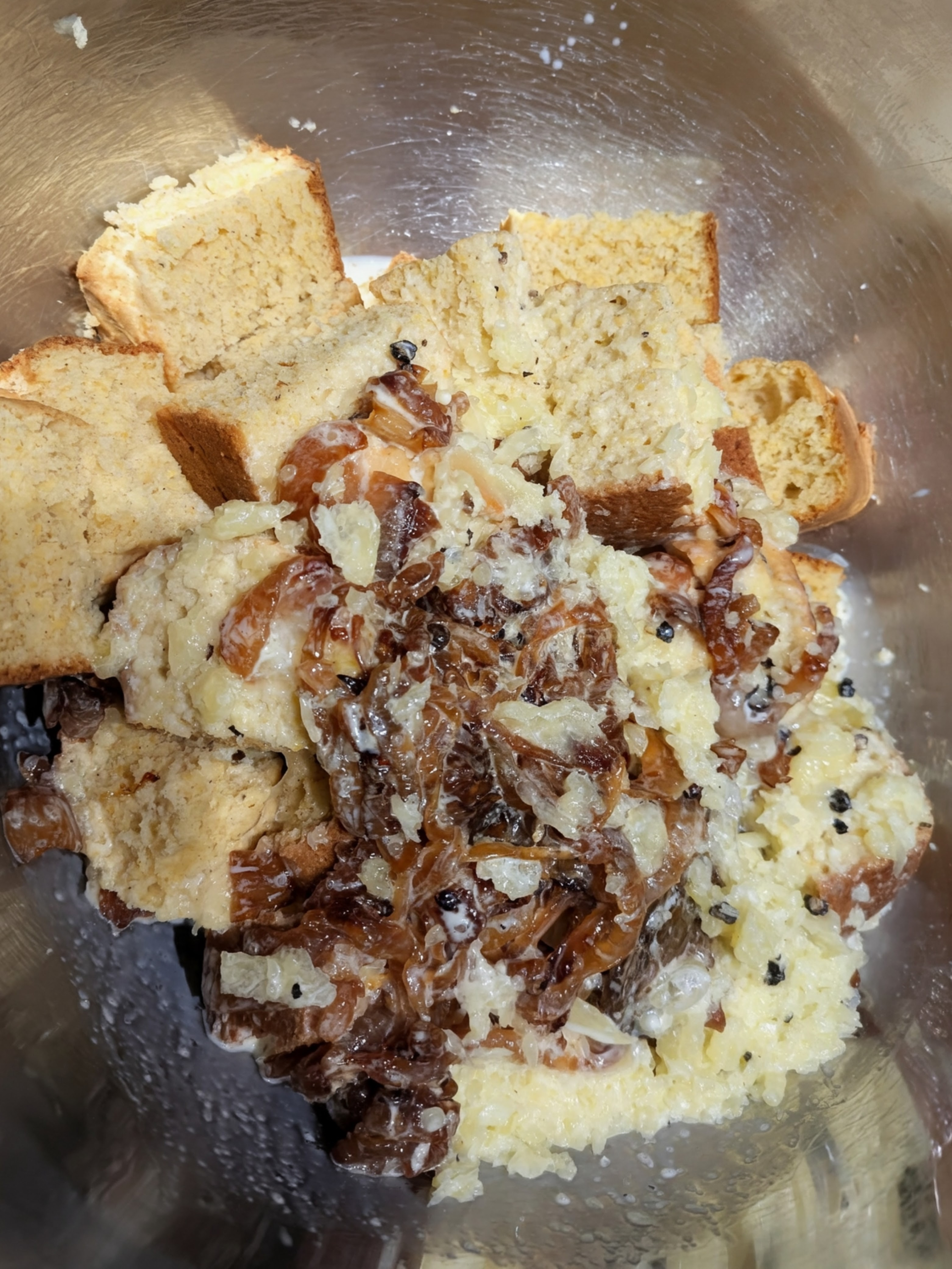 Melt remaining butter and whisk together with eggs, cream, salt and pepper. Add the caramelized onions. Pour the egg mixture over cornbread.