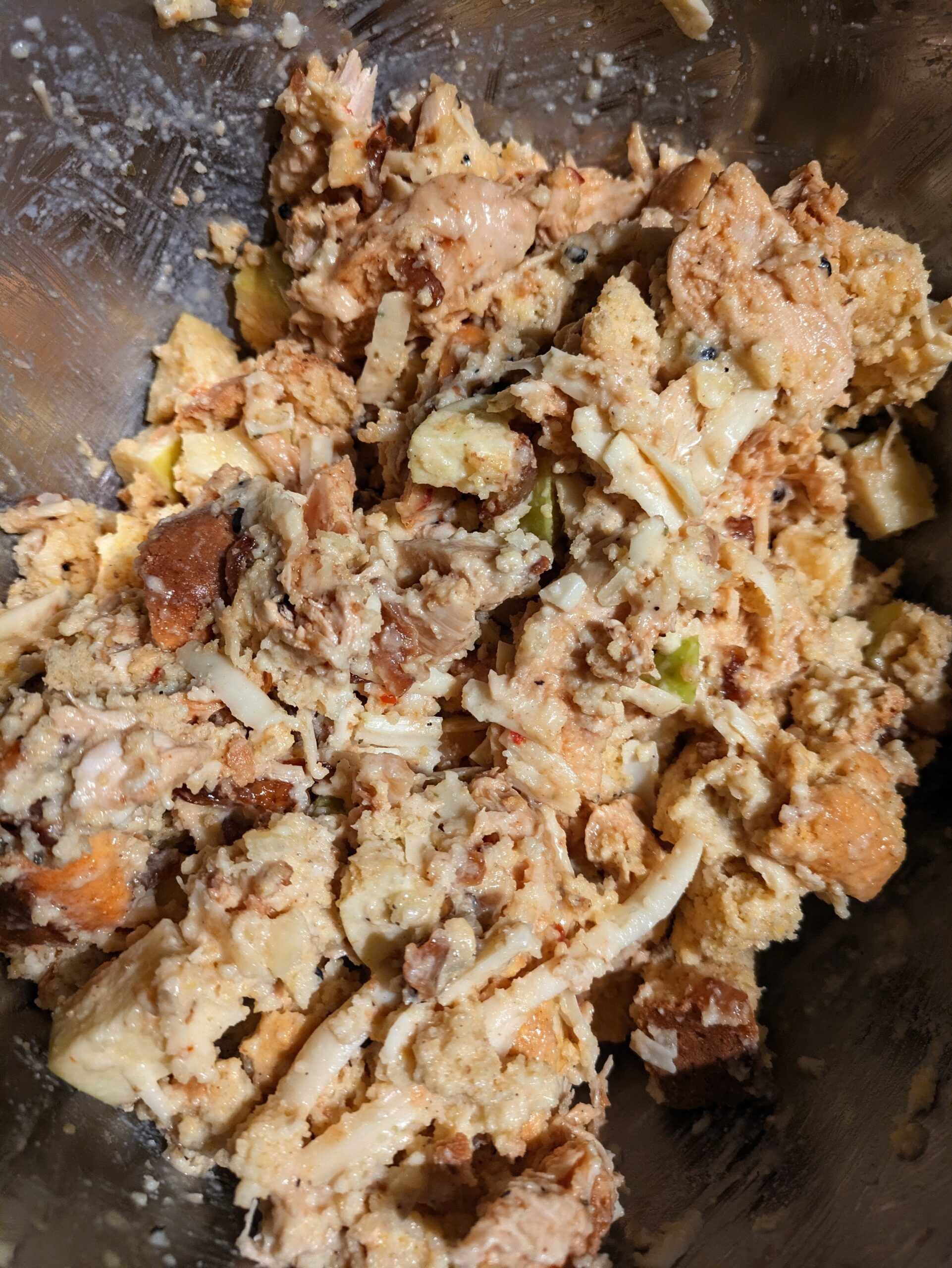 Then add the chicken, apples and cheese and stir the whole thing gently to combine. It will look unappetizing at this point, stay the course it's going to be delicious.