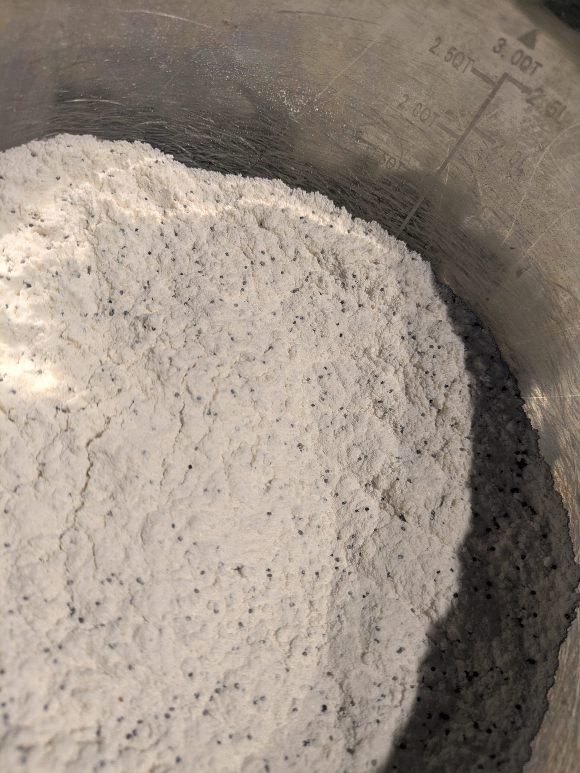 In a smaller mixing bowl whisk together flour , baking power and poppy seeds.